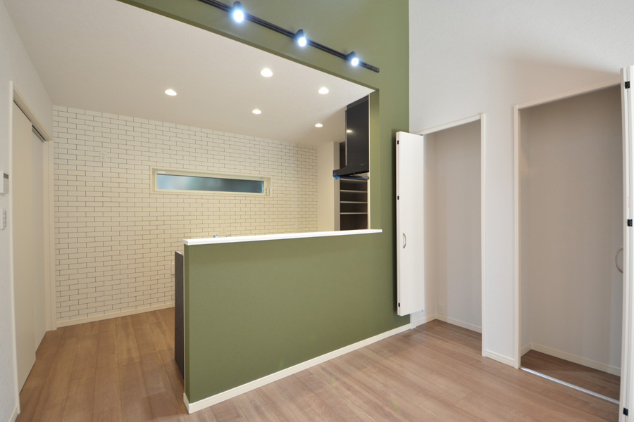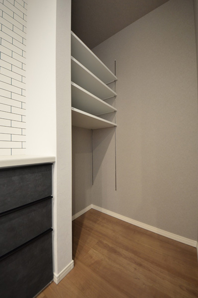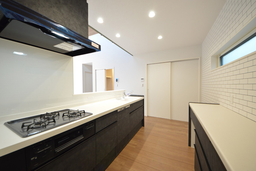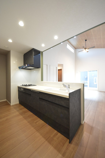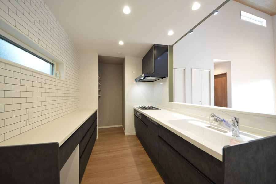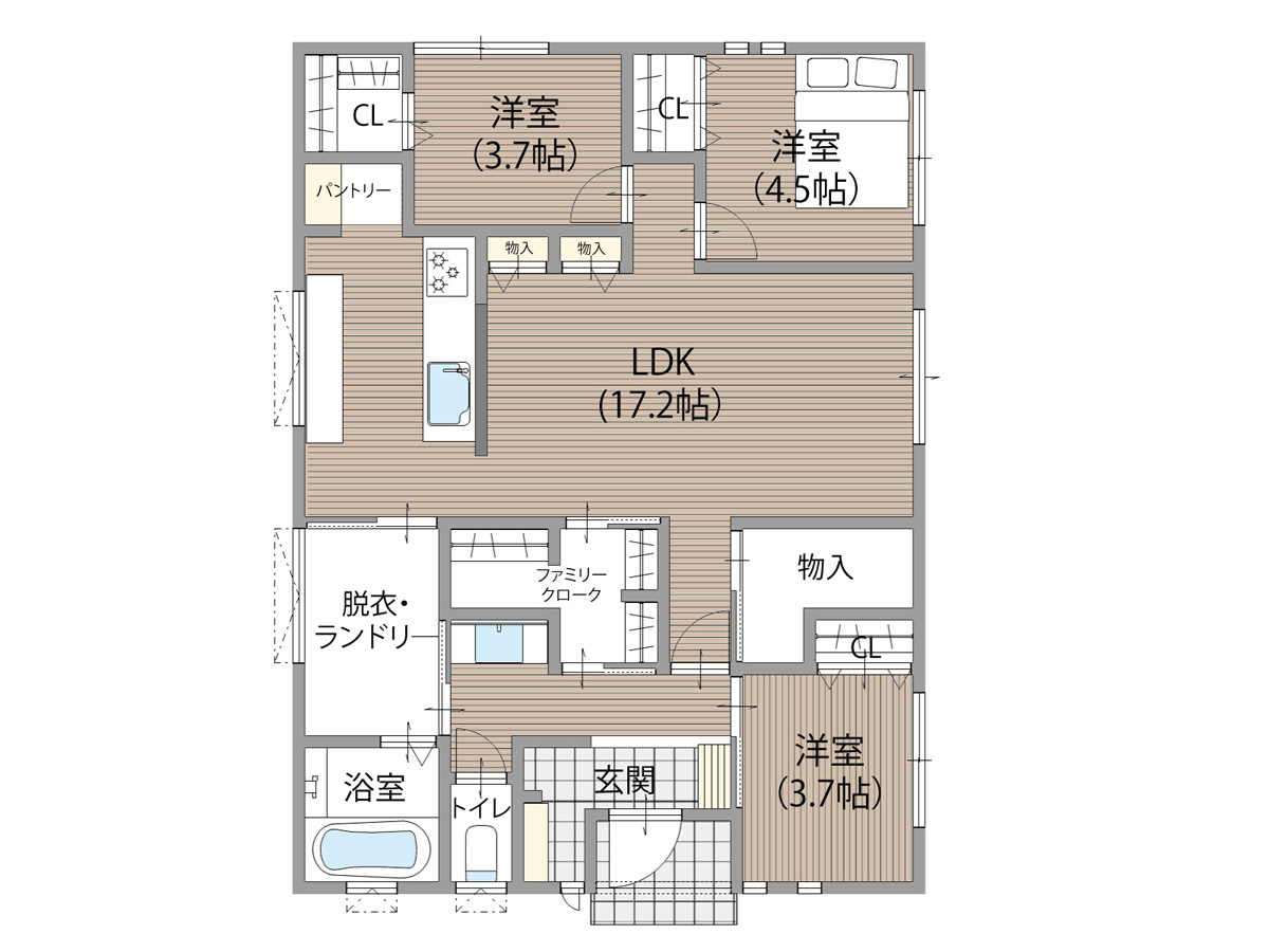 LDKを中心に、それぞれの部屋や水まわりへアクセスでき、家中を快適に回遊できます。キッチンからはリビング・ダイニング全体を見渡すことができ、料理をしながら家族の会話も弾みます。隣接するパントリーは食品や日用品のストックに便利で、キッチンまわりをいつもすっきりと保てます。