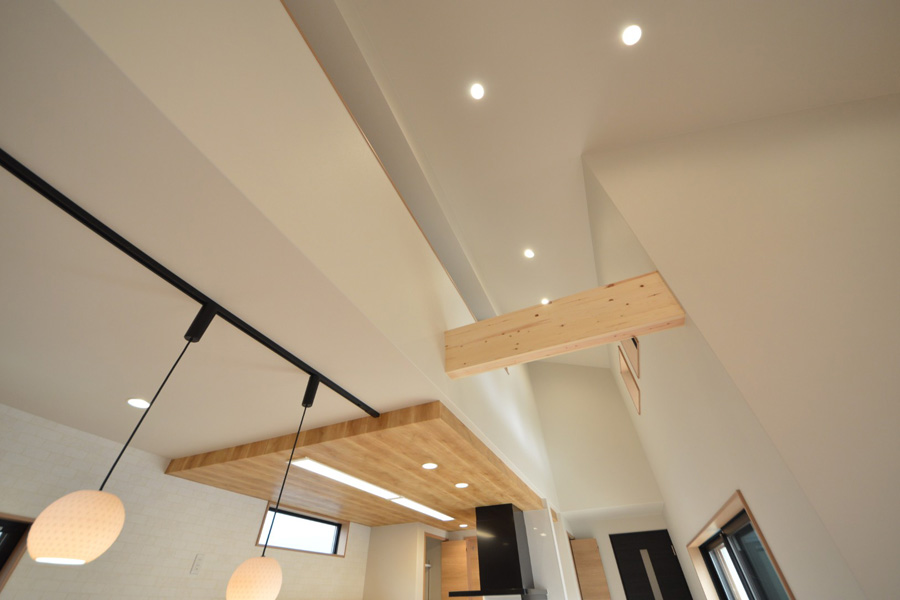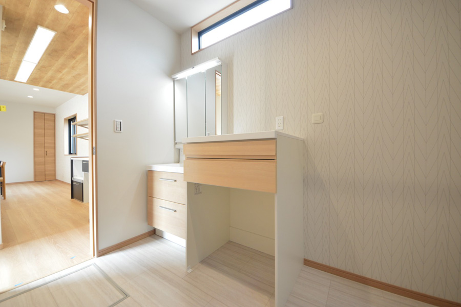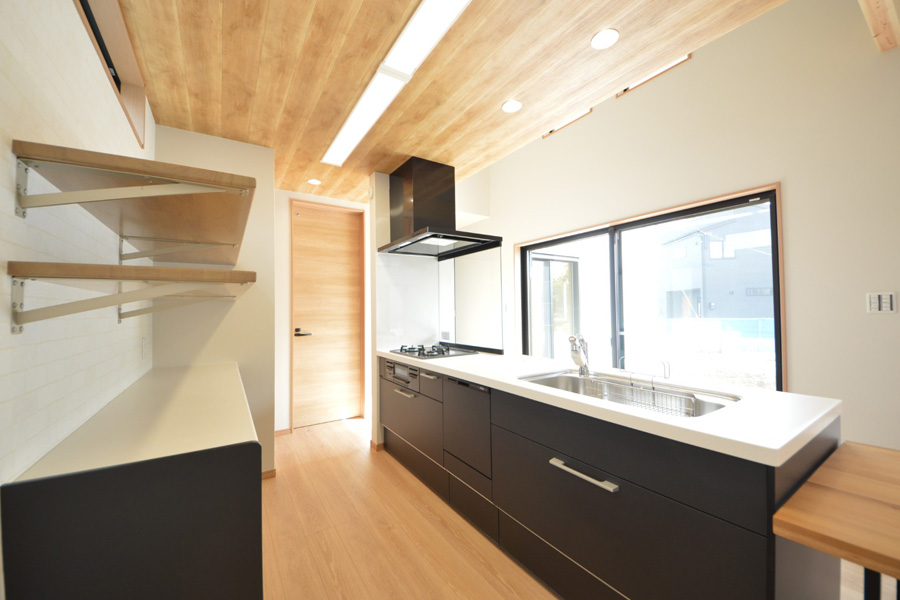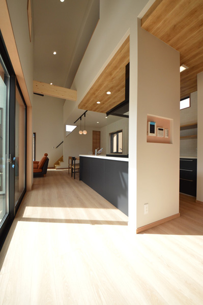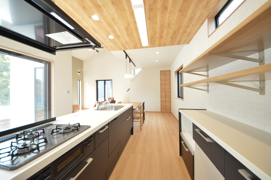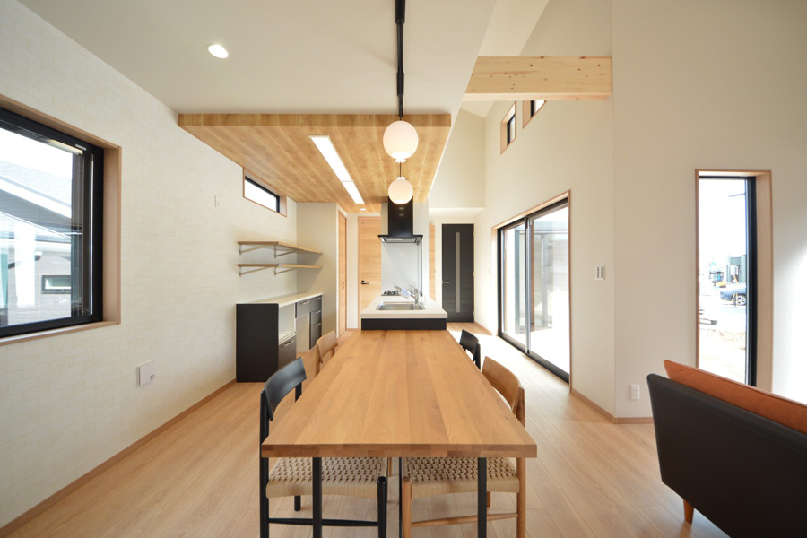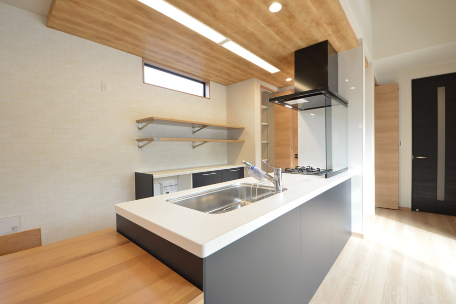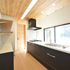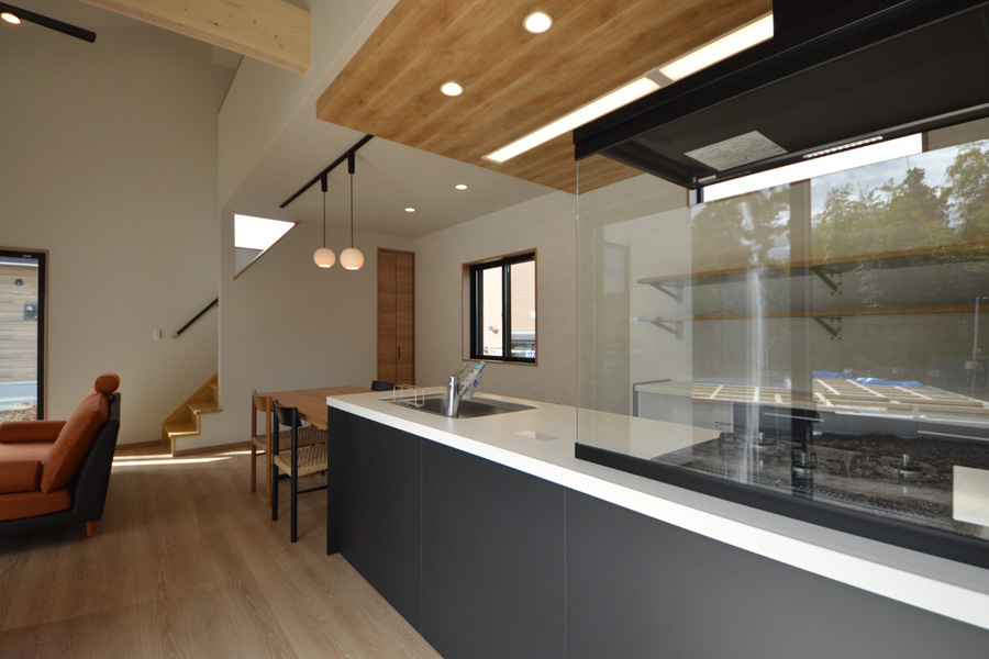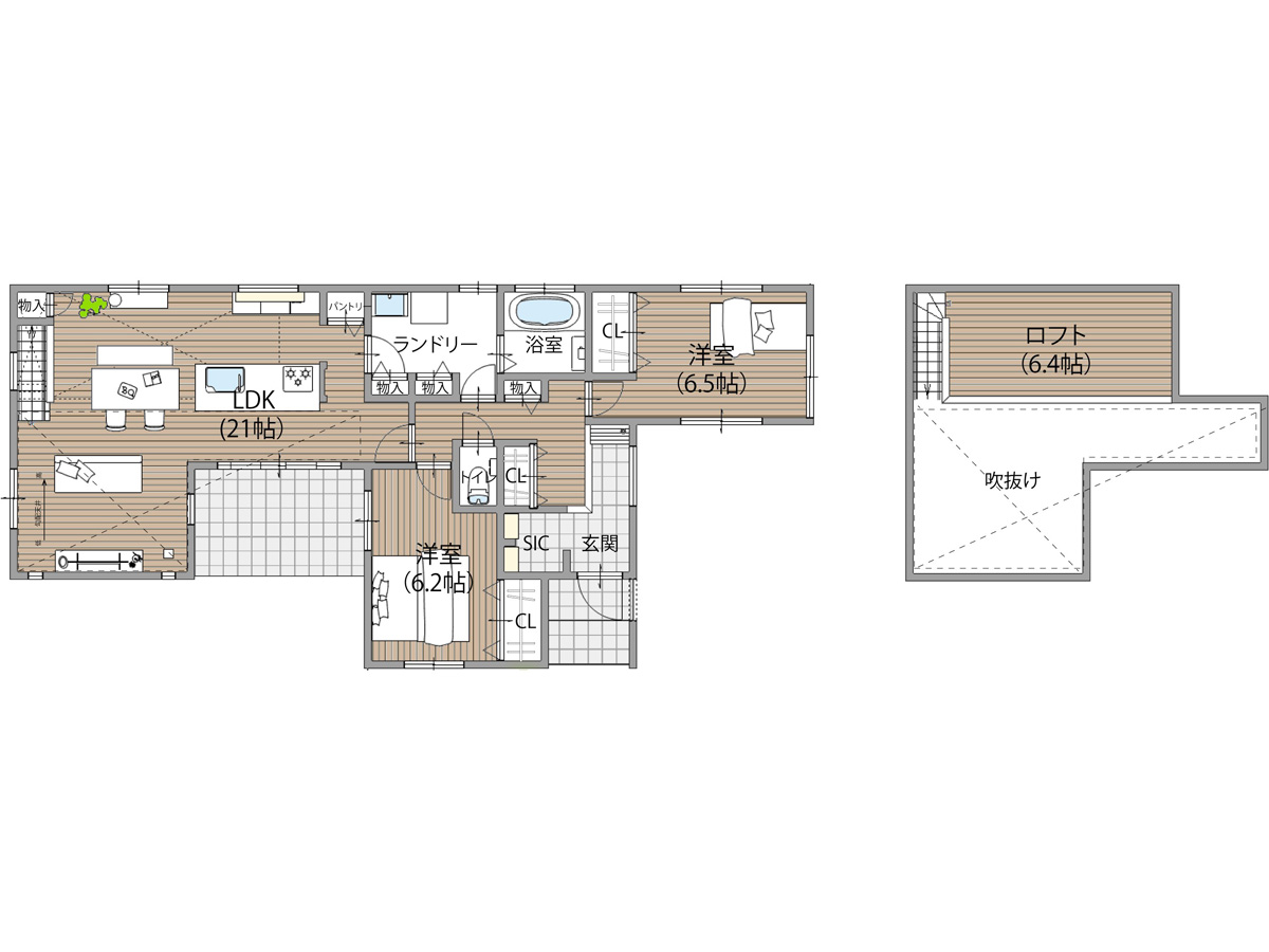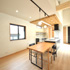 25.29坪 2~3人向けの平屋です。インテリアテイストは今流行りのジャパンディ。落ち着いたアースカラーにブラックのアクセントを入れて。 間取りは、2LDK+ロフト。こちらもSIC、パントリー、ロフトと収納も充実。一日の中で一番長くいる場所がキッチンという方も多いのでは?正面の中庭からたくさんの光が射し込み、明るく開放的なキッチンは、自然と家事も捗ります。