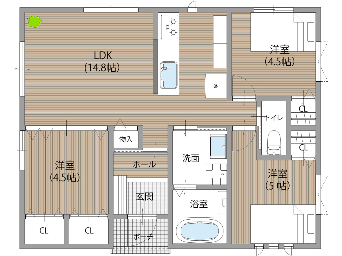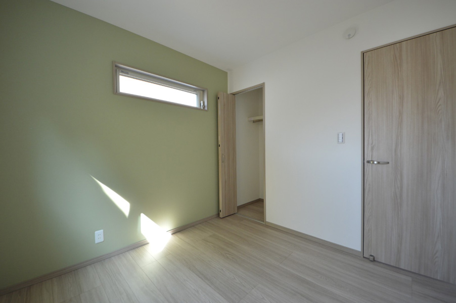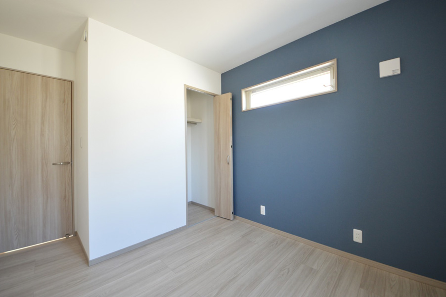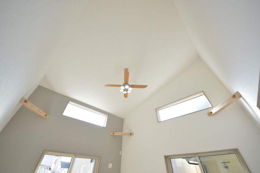 隣地との距離が近く、南側からの採光が難しい敷地条件の中で、明るさと開放感を感じられる空間づくりを大切に計画しました。勾配天井と高窓を採用することで、やさしく光を取り込むLDKを実現しています。間取りはLDKを中心に、プライベートゾーンとパブリックゾーンをゆるやかに分けた構成に。キッチン・洗面所・浴室を横並びに配置することで家事動線を効率化し、忙しい毎日の負担を軽減しました。