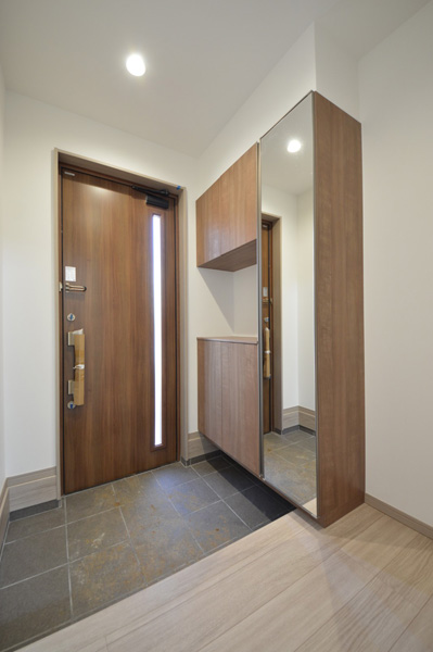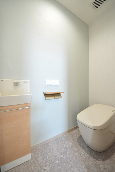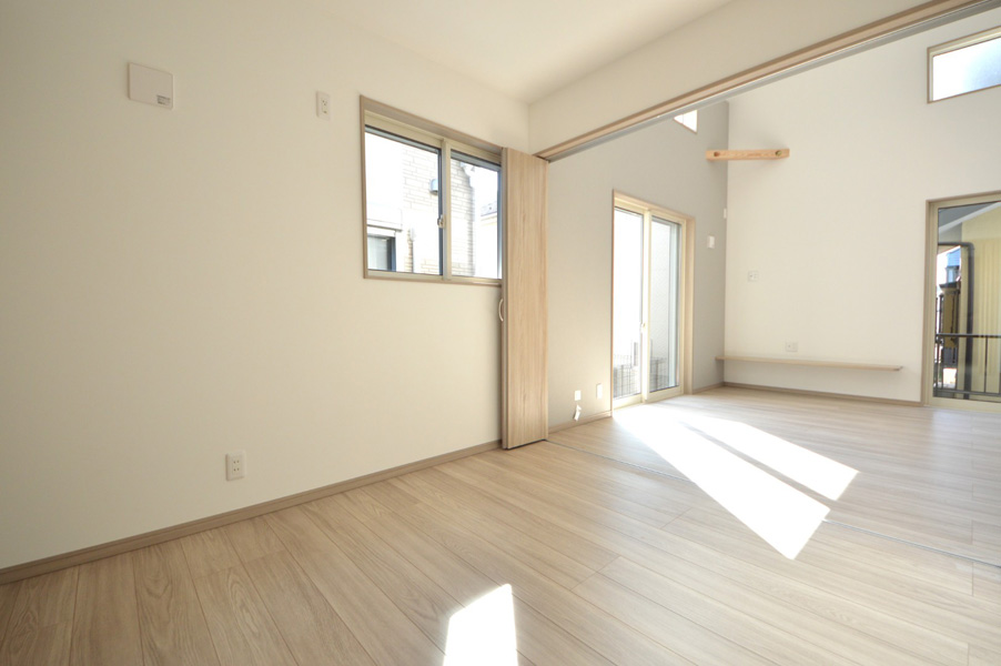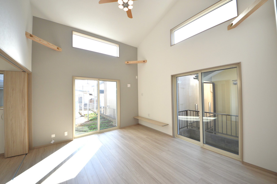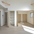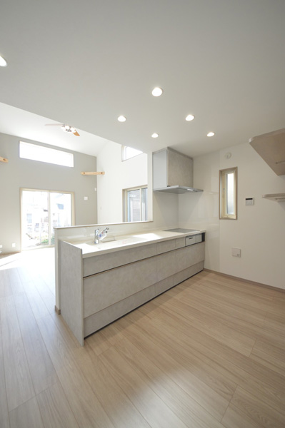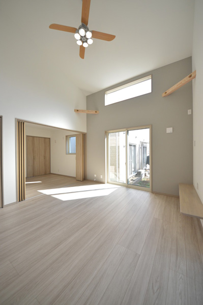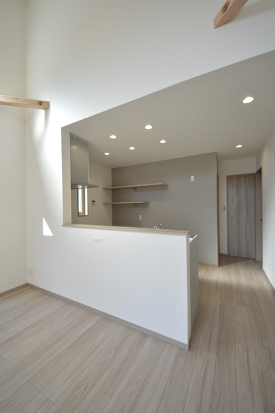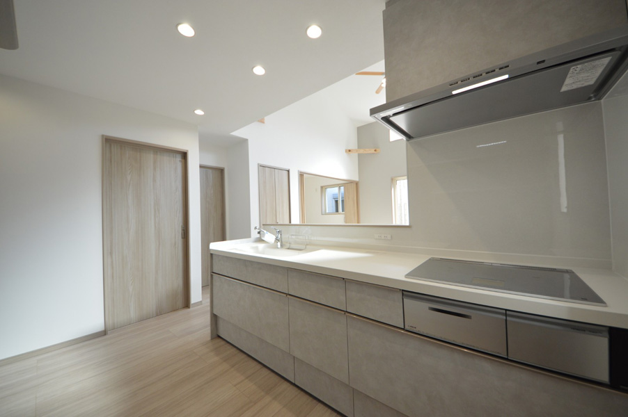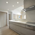 隣地との距離が近く、南側からの採光が難しい敷地条件の中で、明るさと開放感を感じられる空間づくりを大切に計画しました。勾配天井と高窓を採用することで、やさしく光を取り込むLDKを実現しています。間取りはLDKを中心に、プライベートゾーンとパブリックゾーンをゆるやかに分けた構成に。キッチン・洗面所・浴室を横並びに配置することで家事動線を効率化し、忙しい毎日の負担を軽減しました。 空間全体はペールトーンでまとめ、適所に同じ素材のカウンターや棚板を設けることでLDKに統一感をプラス。お施主様のセンスが光る、やさしく心地よい空間に仕上がっています。LDK横の来客用洋室は折戸で仕切ることができ、開放すれば19.3帖の大空間として使用することも可能です。将来まで安心して快適に暮らせる平屋です。