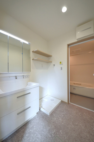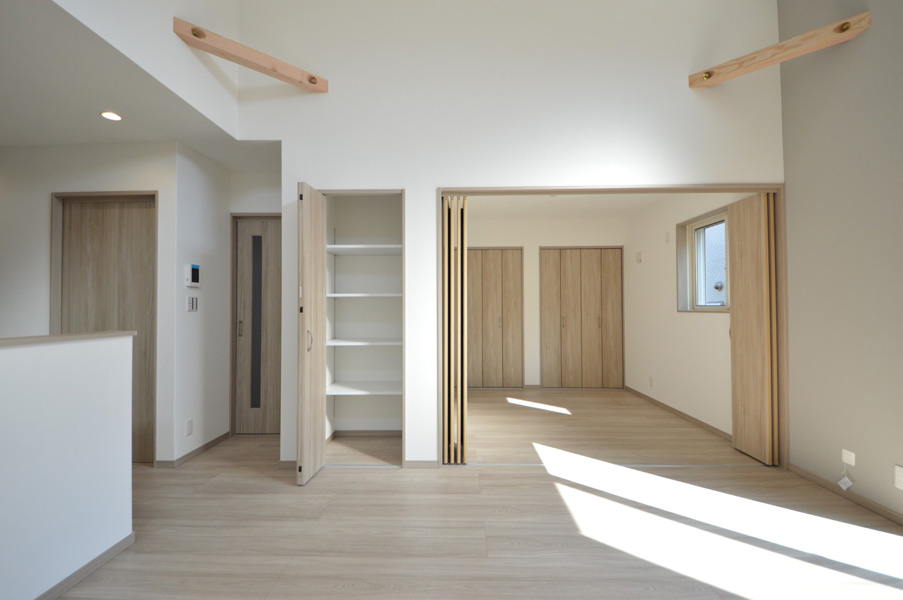 空間全体はペールトーンでまとめ、適所に同じ素材のカウンターや棚板を設けることでLDKに統一感をプラス。お施主様のセンスが光る、やさしく心地よい空間に仕上がっています。LDK横の来客用洋室は折戸で仕切ることができ、開放すれば19.3帖の大空間として使用することも可能です。将来まで安心して快適に暮らせる平屋です。